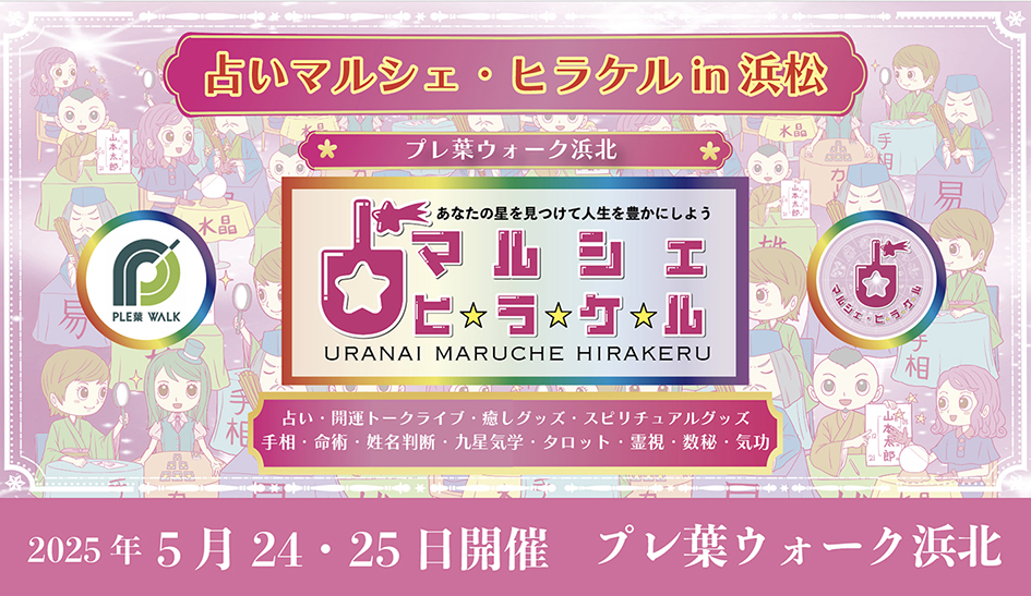 大型連休も終わり、4月からスタートした新生活にも少しずつ慣れてきたこの頃。 そんな今こそぜひおすすめしたいイベントが5/24(土)・25(日)の2日間に渡って開催されます♪ 全国から人気の占い師が浜松に大集合する「第2回 占いマルシェ・ヒラケルin浜松」です!