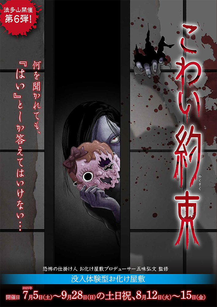 すっかり夏の風物詩となった袋井市・法多山の没入体験型お化け屋敷。土日祝の限定開催ということで、いよいよ9/23(火祝)、27(土)、28(日)の3日間をもってラストを迎えます。 6回目となる今回のストーリーは「こわい約束」。「何を聞かれても、『はい』としか答えてはいけない…」という不気味な約束とともに、ある女性の悲しい記憶を追体験する形で進んでいきます。