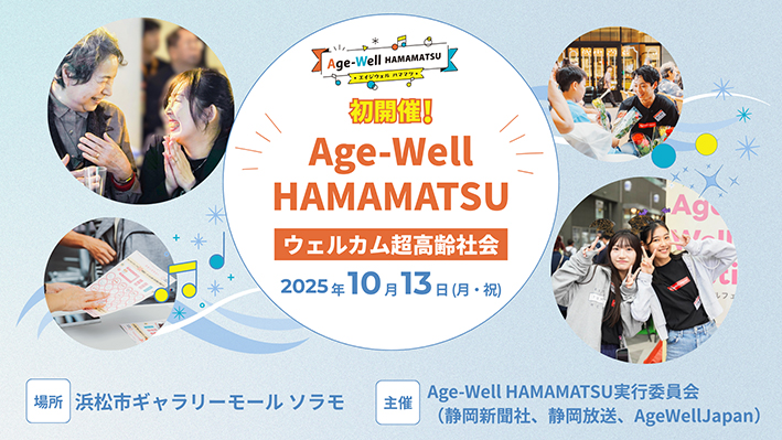 年齢を重ねることを前向きに楽しむ“Age-Well”の精神をテーマに、多世代が交流しながら学び、体験できるイベント「Age-Well HAMAMATSU2025」が10/13(月祝)に浜松初開催! 健康寿命日本一を誇る政令指定都市・浜松を舞台に、音楽・グルメ・学びなど多彩なコンテンツを通じて、より豊かな人生を考えるきっかけをお届けします♪