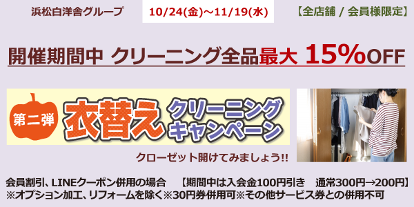衣替えキャンペーン開催期間中 クリーニング全品最大15%OFF(会員割引、LINEクーポン併用の場合)冬物準備は大丈夫?着用直前のカビやシミに驚いた事ありませんか?今スグにクローゼット開けてみましょう!!【期間】10/24(金)~11/19(水)【店舗】浜松白洋舎、ジャブ全店LINE登録がまだの方は登録と、クーポンを店頭でお見せ下さい。※オプション加工、リフォームを除く※30円券併用可※その他サービス券との併用不可
