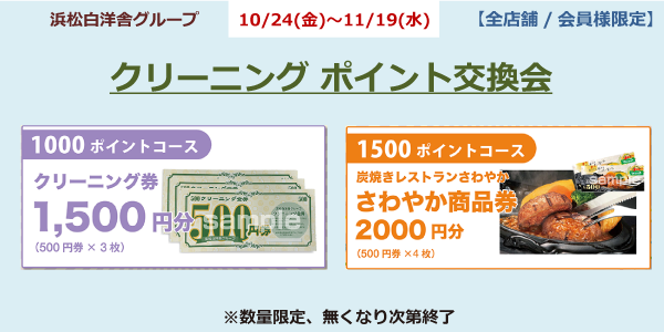 第二弾 クリーニングポイント交換会クリーニングポイントをお得な景品と交換しましょう!!【期間】10/24(金)~11/19(水)【店舗】浜松白洋舎、ジャブ全店1,500ポイントコース 炭焼きレストンさわやか商品券2,000円分1,000ポイントコース クリーニング券1,500円分(500円券×3枚)※数量限定、無くなり次第終了