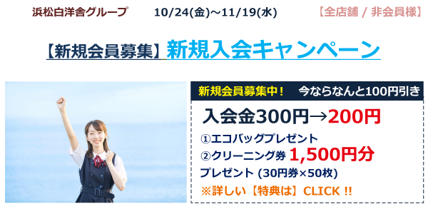 新規入会キャンペーン新規会員募集中! 今ならなんと100円引き入会金300円 → 200円更に!①エコバッグプレゼント②クリーニング券1,500円分プレゼント(30円券×50枚)【期間】10/24(金)~11/19(水)【店舗】浜松白洋舎、ジャブ全店