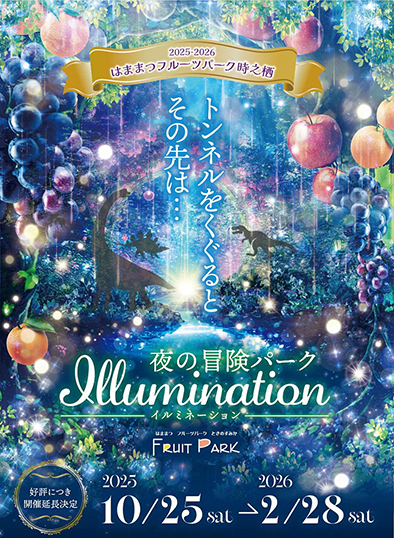 地元イルミネーションの代表格として毎年多くの人を魅了する、はままつフルーツパーク時之栖の「ウィンターイルミネーション」。 今回のテーマは「夜の冒険パーク」。子どもたちが思わず何周もしたくなるような、さまざまな趣向が張り巡らされています。 入り口をくぐるとまず出迎えてくれるのは「ウェルカム広場」。高さ5mのきらめくシンボルツリーが“光の森”へと誘います。