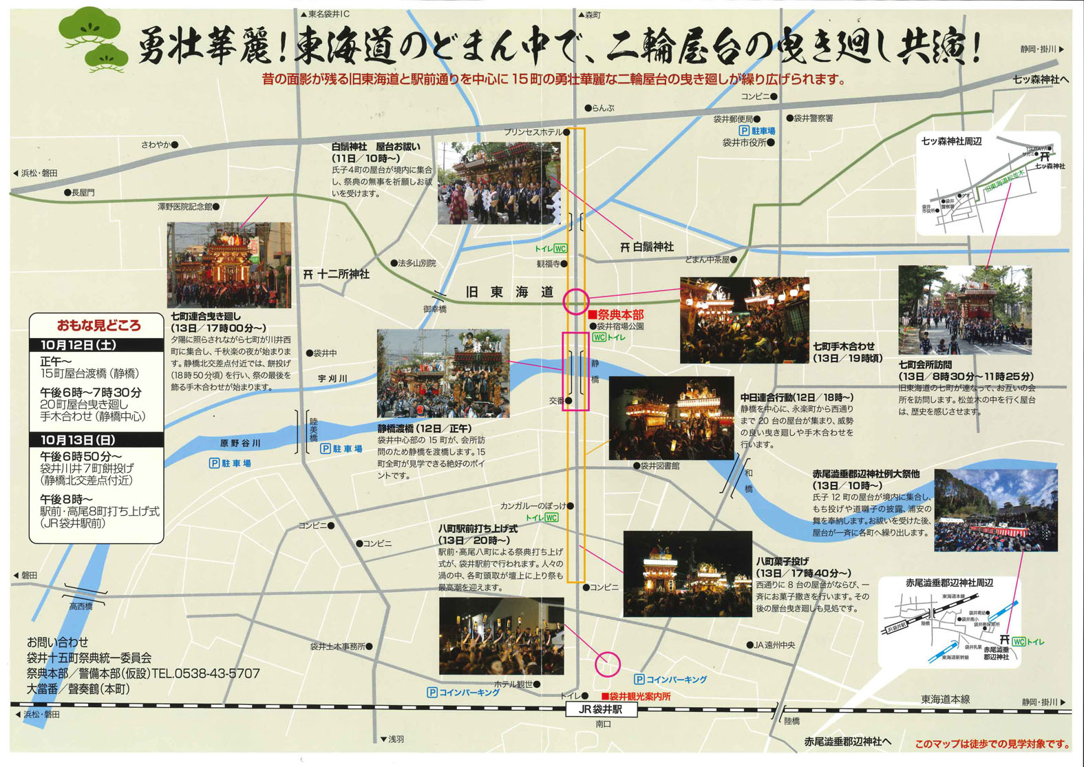 見所は、五穀豊穣・無病息災を願いながら、お囃子にあわせての屋台曳き廻し。15町の勇壮華麗な二輪屋台が旧東海道と駅前通りに繰り出します。袋井市民の熱気とともに秋の袋井路が祭り一色に染め上げられる様は必見です。15町すべての屋台を見学したいなら静橋渡橋(12日正午)、小さなお子さんと一緒に行くなら、最終日(13日)の夜に行われるお菓子投げや打ち上げ式がおすすめです。